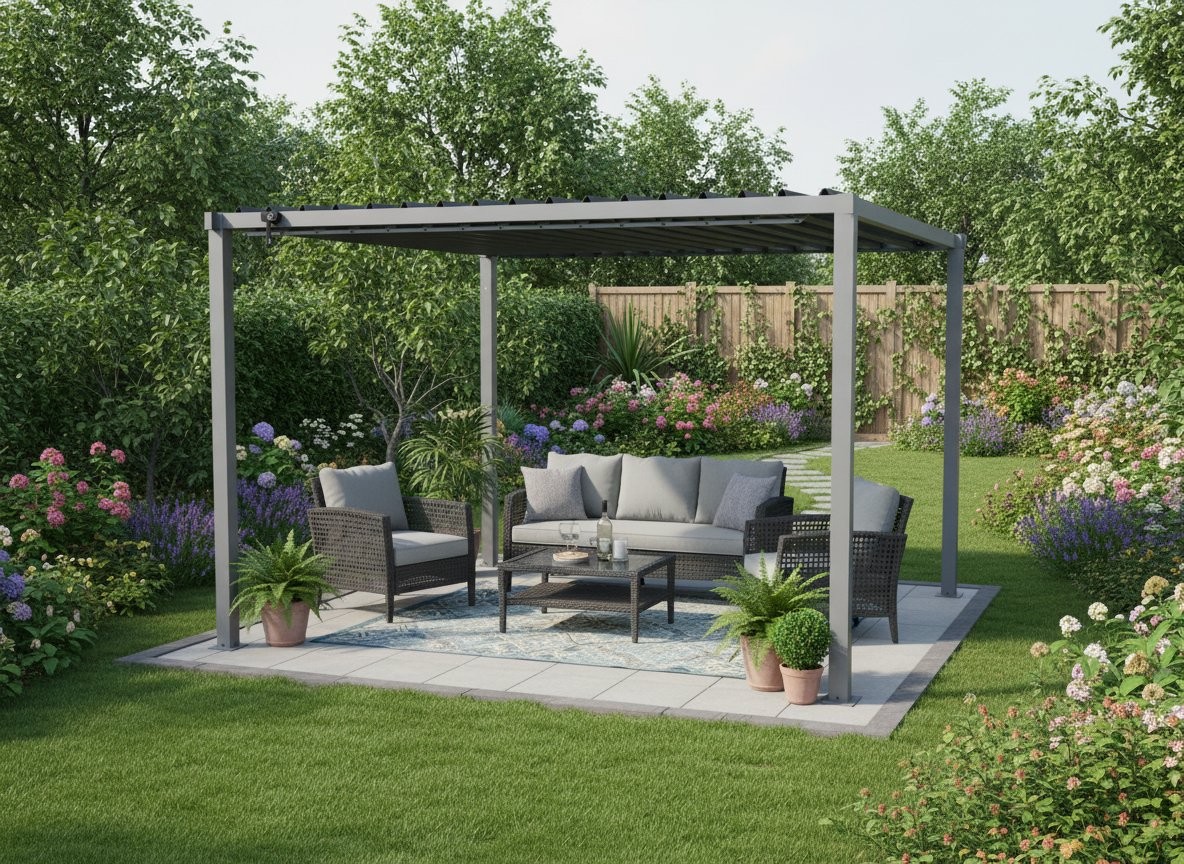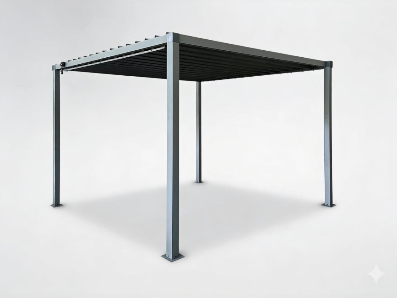 Vrtna pergola Sena (s jekleno streho, siva, 3 x 3 m) je stabilna rešitev za vrt, teraso ili prostor ob hiši. Siva barva poudari sodoben videz, pocinkana jeklena streha pa nudi zaščito pred soncem, dežjem i spremenljivim vremenom.