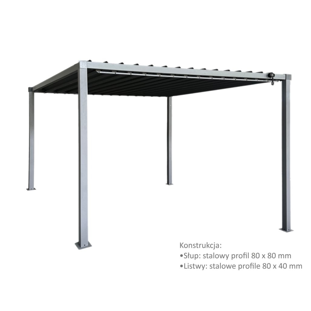 Pergola meri 3 x 3 x 2,2 m. Profil stebra znaša 80 x 80 mm, prečni profil pa 80 x 40 mm. Strešna pločevina je iz pocinkanega jekla debeline 0,8 mm. Model je prilagojen spremenljivim klimatskim razmeram.