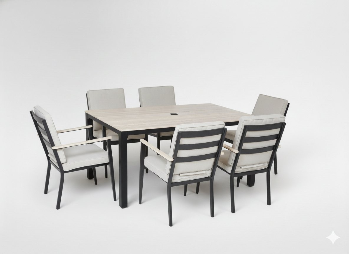Komplet uključuje stolom i šest stolov s nasloni za roke. Plošča mize iz aluminijastih letvic ima odprtino za suncobran. Blazine iz tkanine Olefin prispevajo k udobnejšemu sedenju. Aluminijasta konstrukcija je namenjena zunanji uporabi.