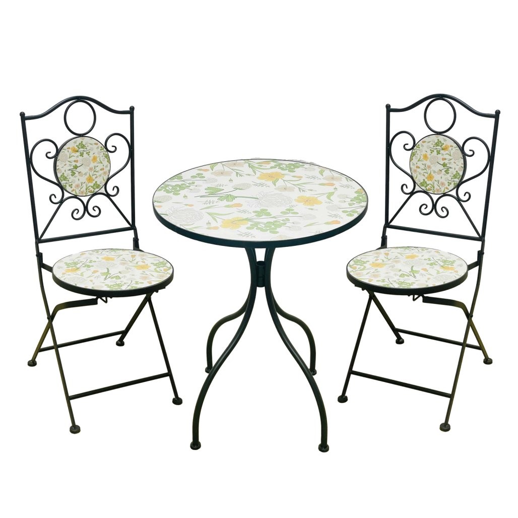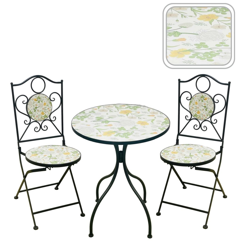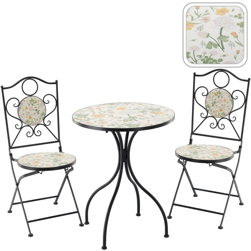 Vrtni mozaični set Antos donosi promišljeno rješenje za uredan i udoban vanjski prostor za objedovanje ili opuštanje. Materijali, kao što su metal, mozaik, doprinose urednom izgledu i praktičnoj upotrebi.