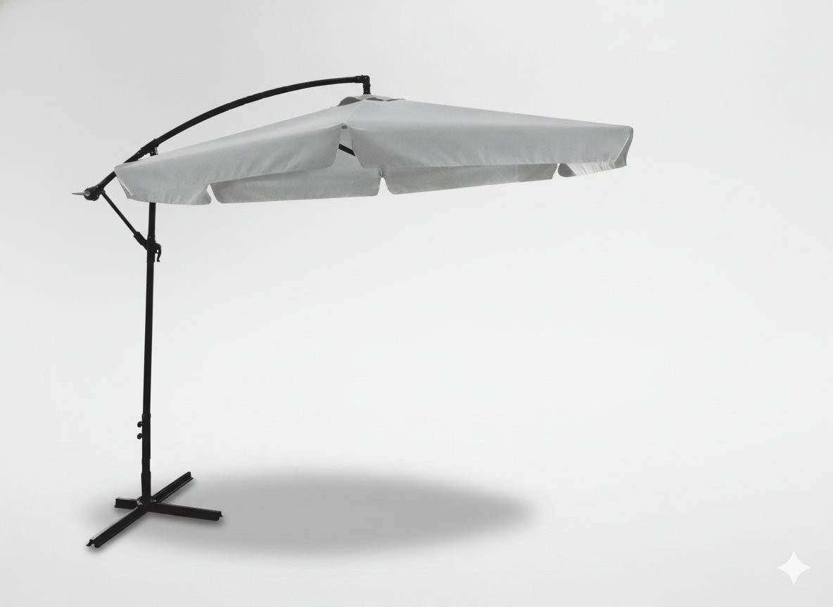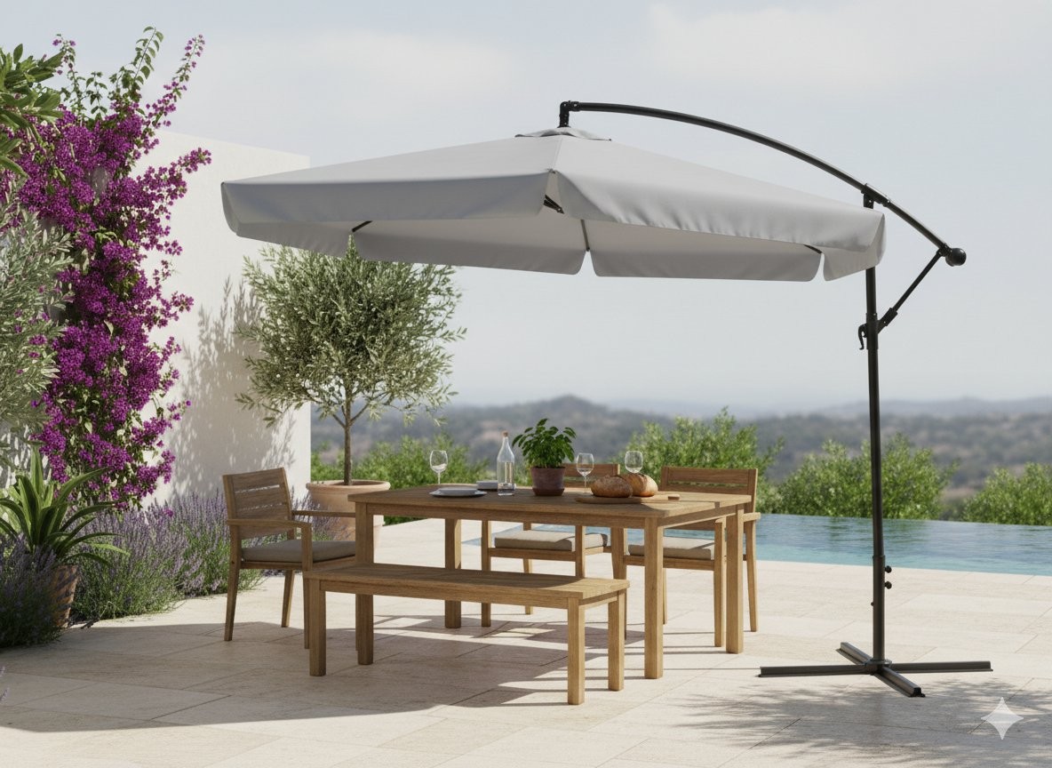 Konstrukcija tipa banana pušča več uporabnega prostora pod senčnikom brez sredinskega droga. Vodoodbojna senčna površina pomaga pri zaščiti pred soncem, UV žarki i rahlim dežjem. Nastavljiv naklon omogućuje lažje prilagajanje smeri sonca. Prezračevalna odprtina izboljša kroženje zraka, priložena prevleka pa olajša shranjevanje.