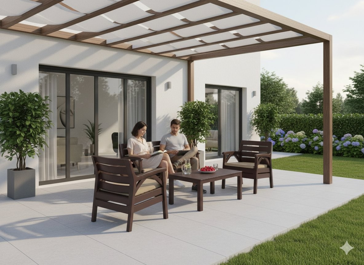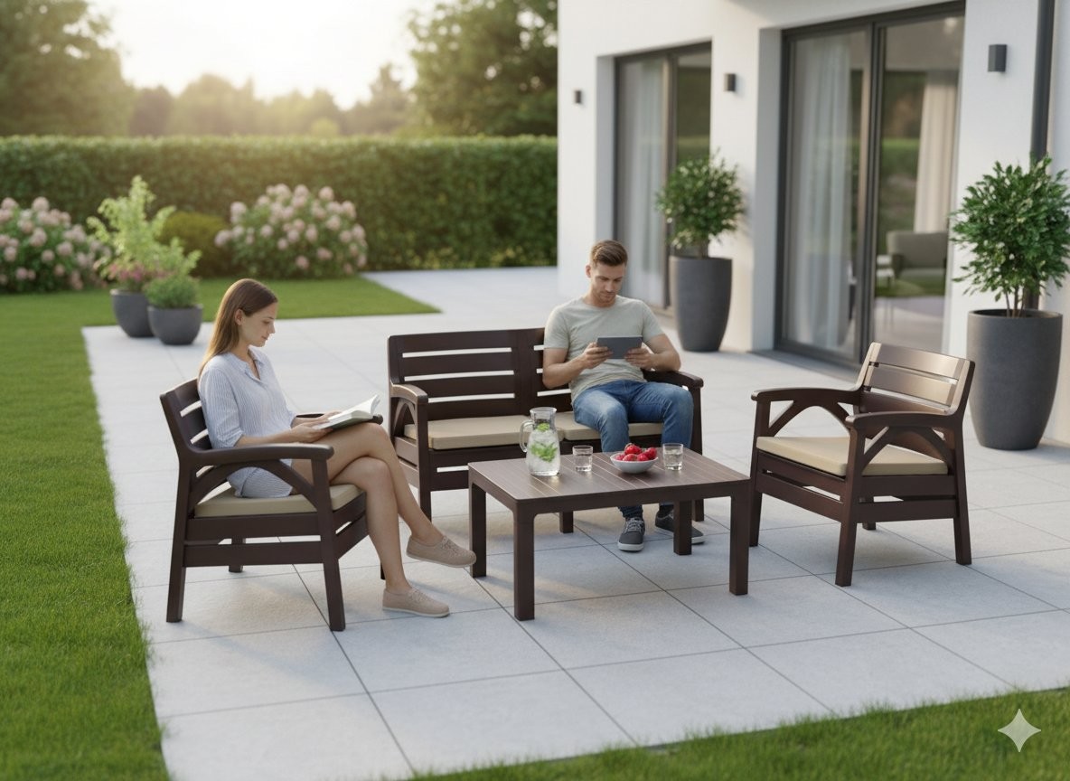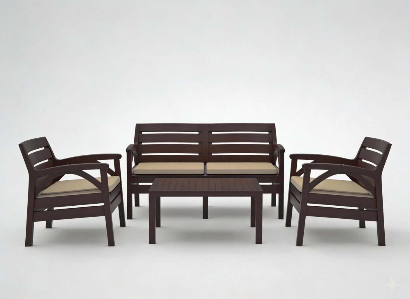 Komplet uključuje dva fotelja, dvosedežno klop i stolom. Bež blazine povečajo udobje pri sedenju. Postavitev je prikladna za vsakodnevni počitek, pogovor ili kavo na prostem.