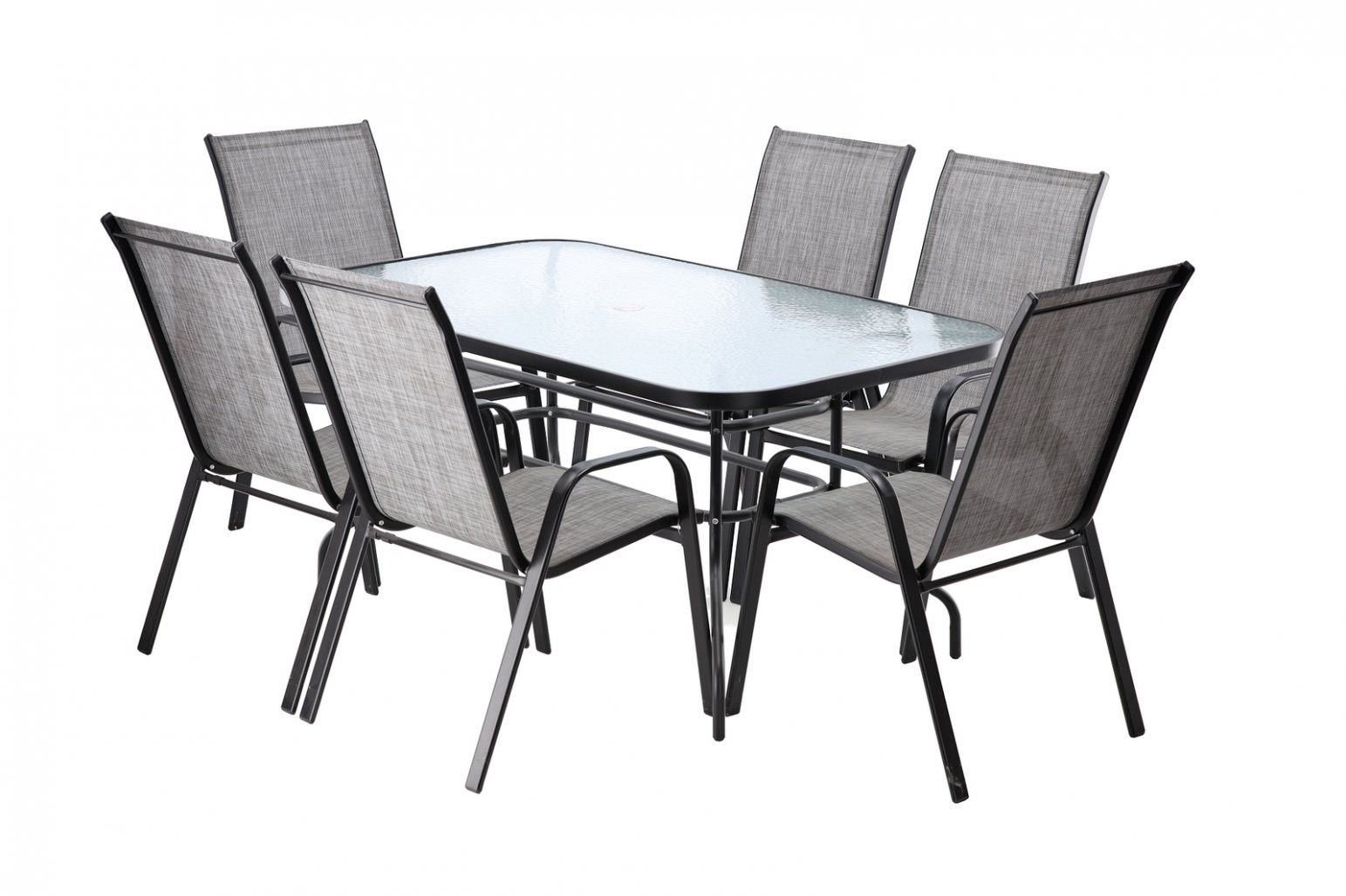 Komplet uključuje mizo i šest stolov. Dimenzije: 150x90x70 cm. Pogodan je za upotrebu u vrtu i na terasi. Materijali su prikladni za vanjsku upotrebu.