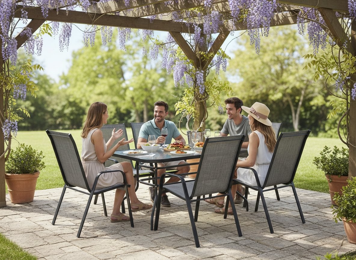 Vrtna garnitura Niko (miza + 6 stolov) objedinjuje stol i stolice u usklađen komplet za druženje na otvorenom. U izradi su korišteni tekstil, kaljeno staklo i čelik.