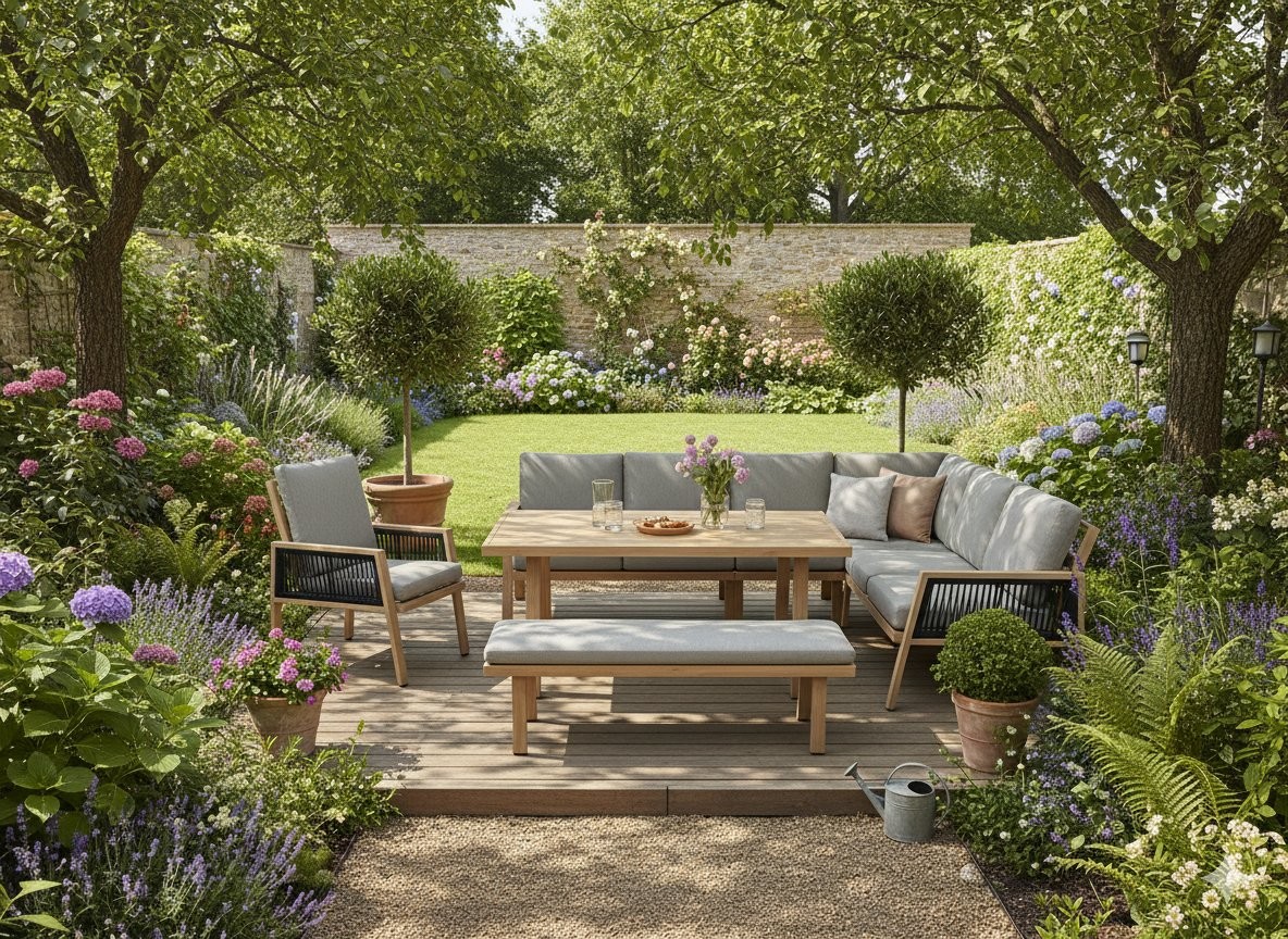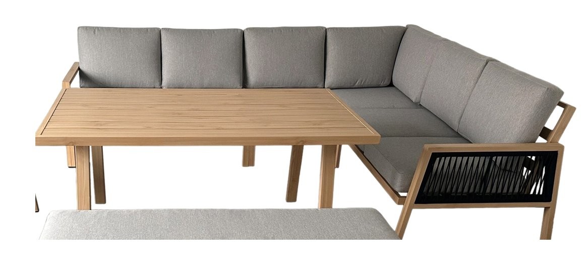 Komplet vključuje 2 dvoseda, kotni element, sredinski element, fotelja, klop i stolić. Modularna zasnova omogoča prilagodljivo postavitev. Dvosed: 125 x 79 x 75 cm.
