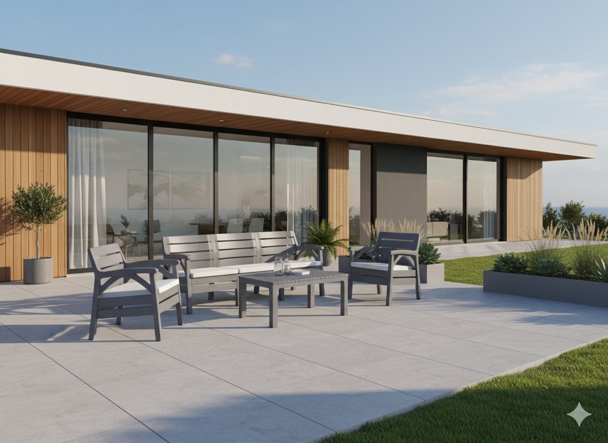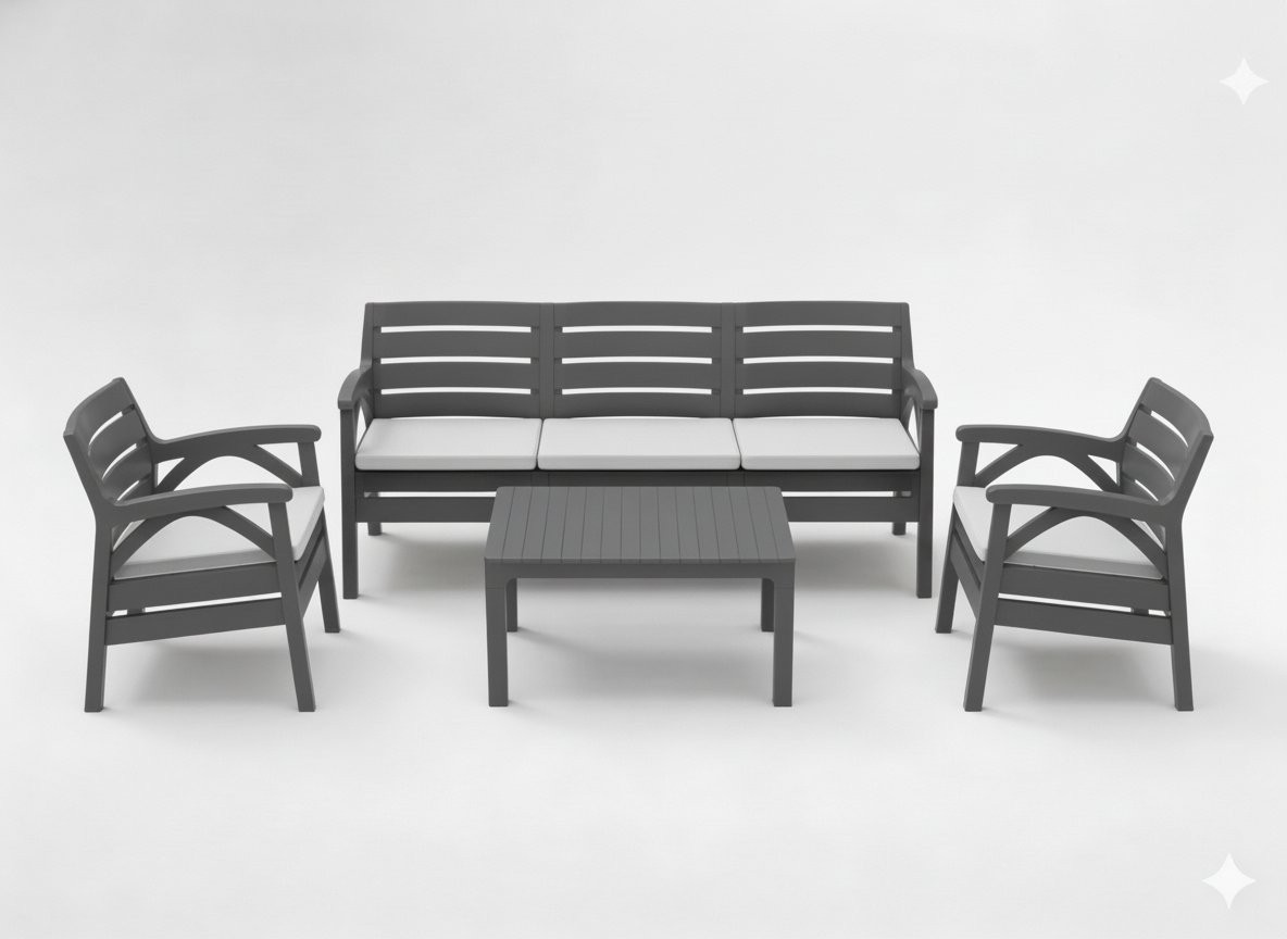 Komplet vključuje 2 fotelje, trosjednu klupu i stol. Priloženi so jastuci. Fotelj: 66 x 64 x 80 cm.