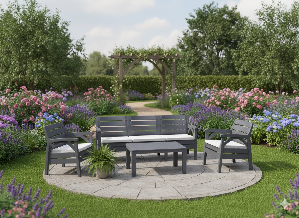Vrtni set Santana (antracit/bež) donosi promišljeno rješenje za uredan i udoban vanjski prostor za objedovanje ili opuštanje. Izvedba u nijansama antracit, jastuci: bež omogućuje jednostavno usklađivanje s različitim vanjskim ambijentima.