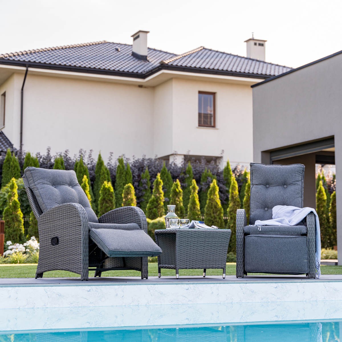Priuštite si vrtni set SONGO gdje se možete opustiti i pasti u zagrljaj udobnog sjedala tijekom ljetnih mjeseci. Dobijate i stol gdje možete staviti knjigu ili piće kako bi vaš dan bio savršen. Pogodno za vrt ili terasu. Dostupno u sivoj boji.