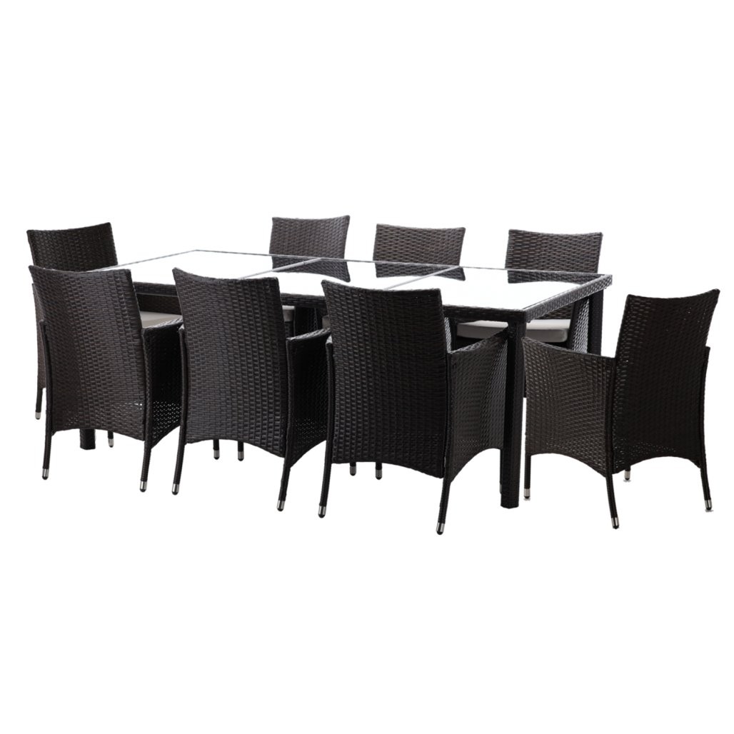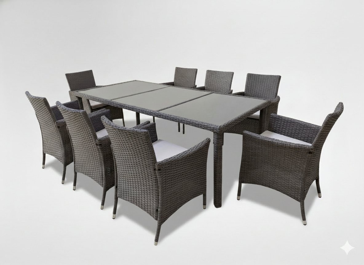 Komplet vsebuje velik stol i osem foteljev, zato je primeren za družinske obroke i druženje na otvorenom. Pocinčani čelični okvir prispeva k stabilnosti, kaljeno staklo na mizi pa dopolnjuje funkcionalno površino.