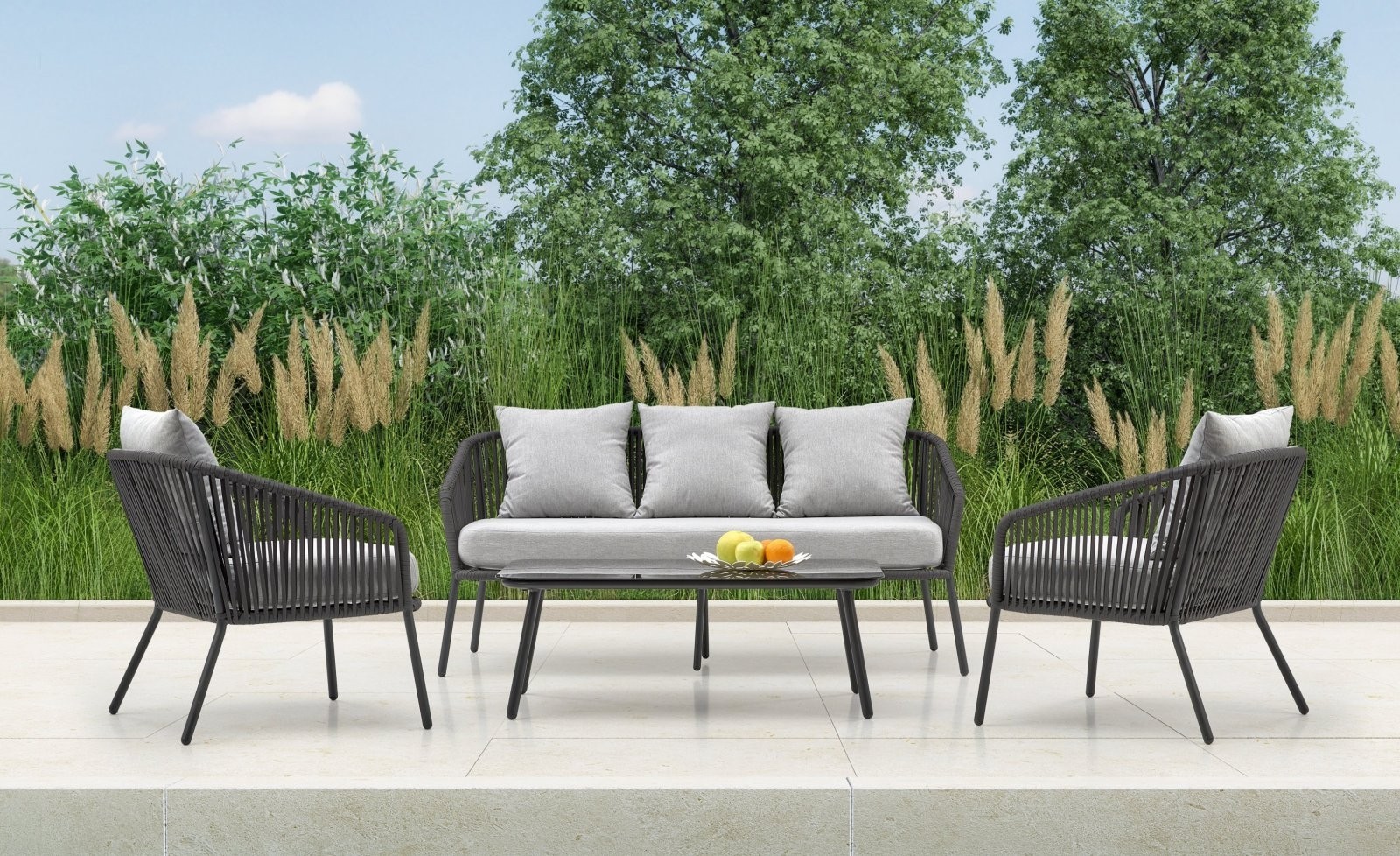 Vrtni set Viraen s aluminijskim okvirom i udobnom tkaninom savršen je za modernu terasu. Vrtni set uključuje garnituru za sjedenje i stol za potpuno vanjsko opuštanje.