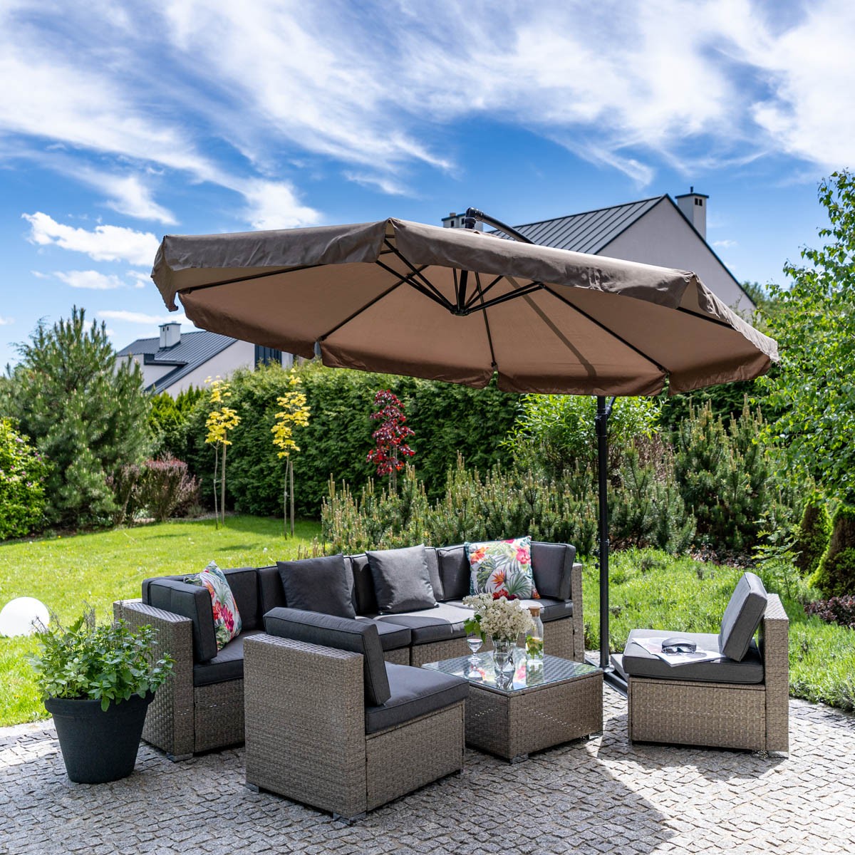 Priuštite si učinkovit i jednostavan BOGOTA suncobran, koji će osigurati da možete provesti dane u svom vrtu ili terasi tijekom vrućih mjeseci. Sigurnost suncobrana je zajamčena, jer je okvir izrađen od metala, a nadstrešnica od poliestera. Otvaranje i zatvaranje omogućeno je okretanjem poluge. Dostupna je u smeđoj boji.