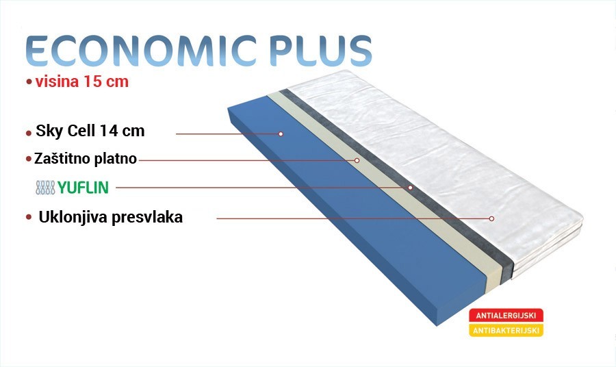 Vzmetnica EKONOMIK PLUS je vzmetnica s peno, višine 15 cm. Je antialergijska, s snemljivo zgornjo prevleko. Vzmetnica je pakirana v rolo za enostavnejši transport.