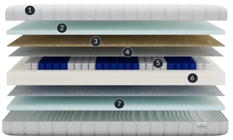 - 7-zonska jezgra: središnji dio madraca sastoji se od opružne jezgre s otprilike 272 opruge/m². To povećava udobnost i elastičnost madraca. Tako pruža dodatnu potporu za teže dijelove tijela poput bokova. Struktura madraca omogućuje pravilno poravnanje kralježnice tijekom spavanja.
