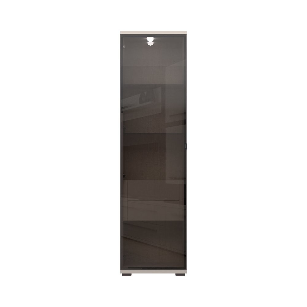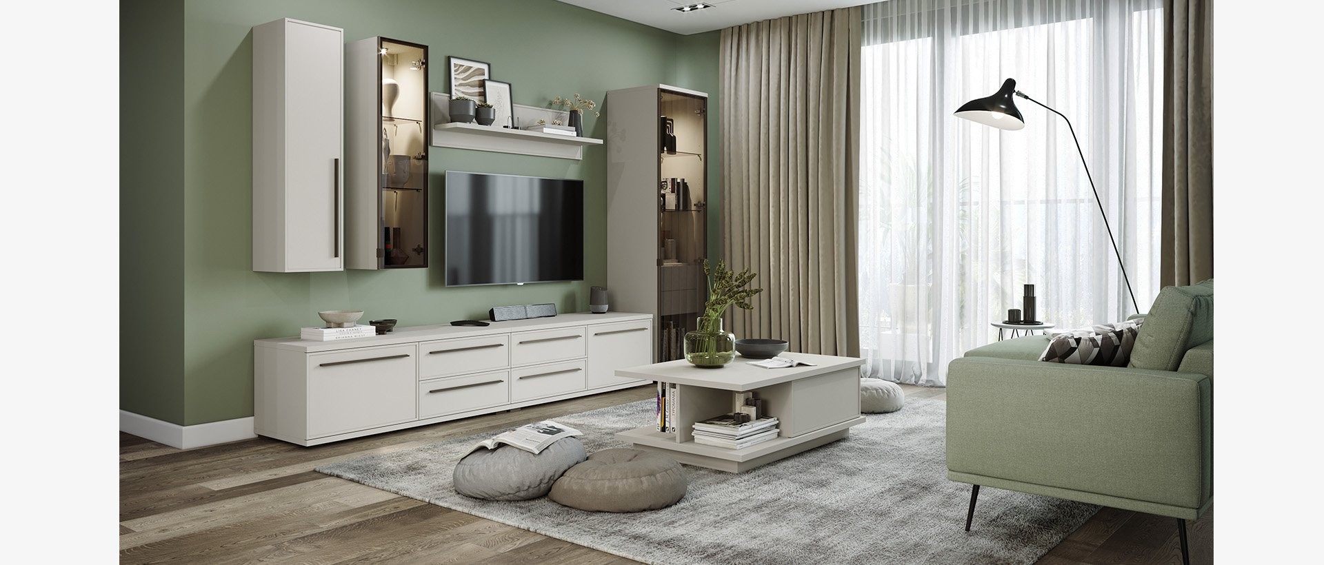 Komoda je premazana z nežnim mat UV lakom v barvi Kašmir, njena notranjost pa je v dekorju Textil, kar ustvarja prijetno in sodobno vzdušje. Vgrajena LED osvetlitev dodatno poudari estetsko dovršenost tega kosa pohištva.