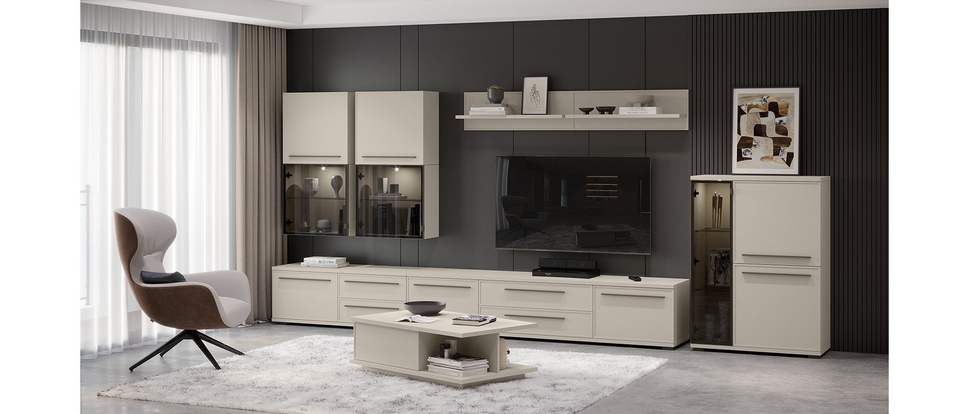 Komoda je lakirana z nežnim mat UV lakom v barvi Kašmir, kar ji daje prefinjen videz. Notranjost je obdelana v dekorju tekstila, kar dodatno poudari njen estetski učinek.
