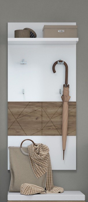 Zidna vješalica je napravljena iz iverice (38 mm) u bijeli boji visokom sijaju, koja je lakirana s UV lakom. Drveni dodaci u hrast boji su napravljeni iz MDF materijala. Rubovi su ABS (mekani rubovi).