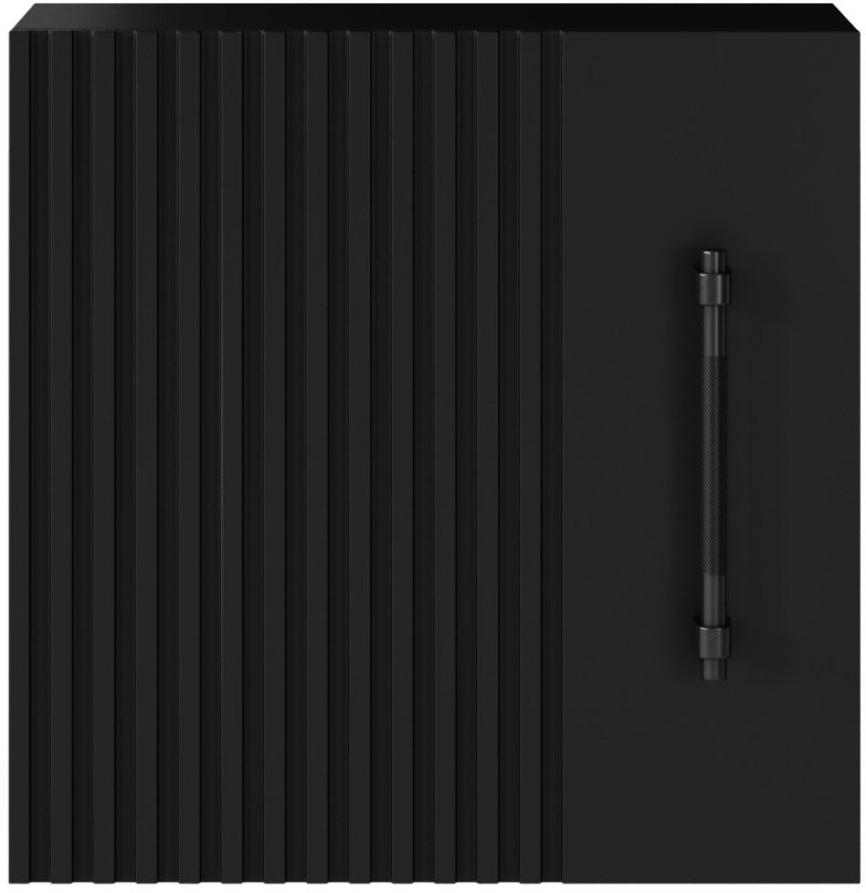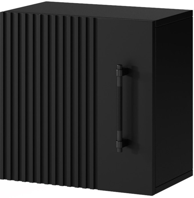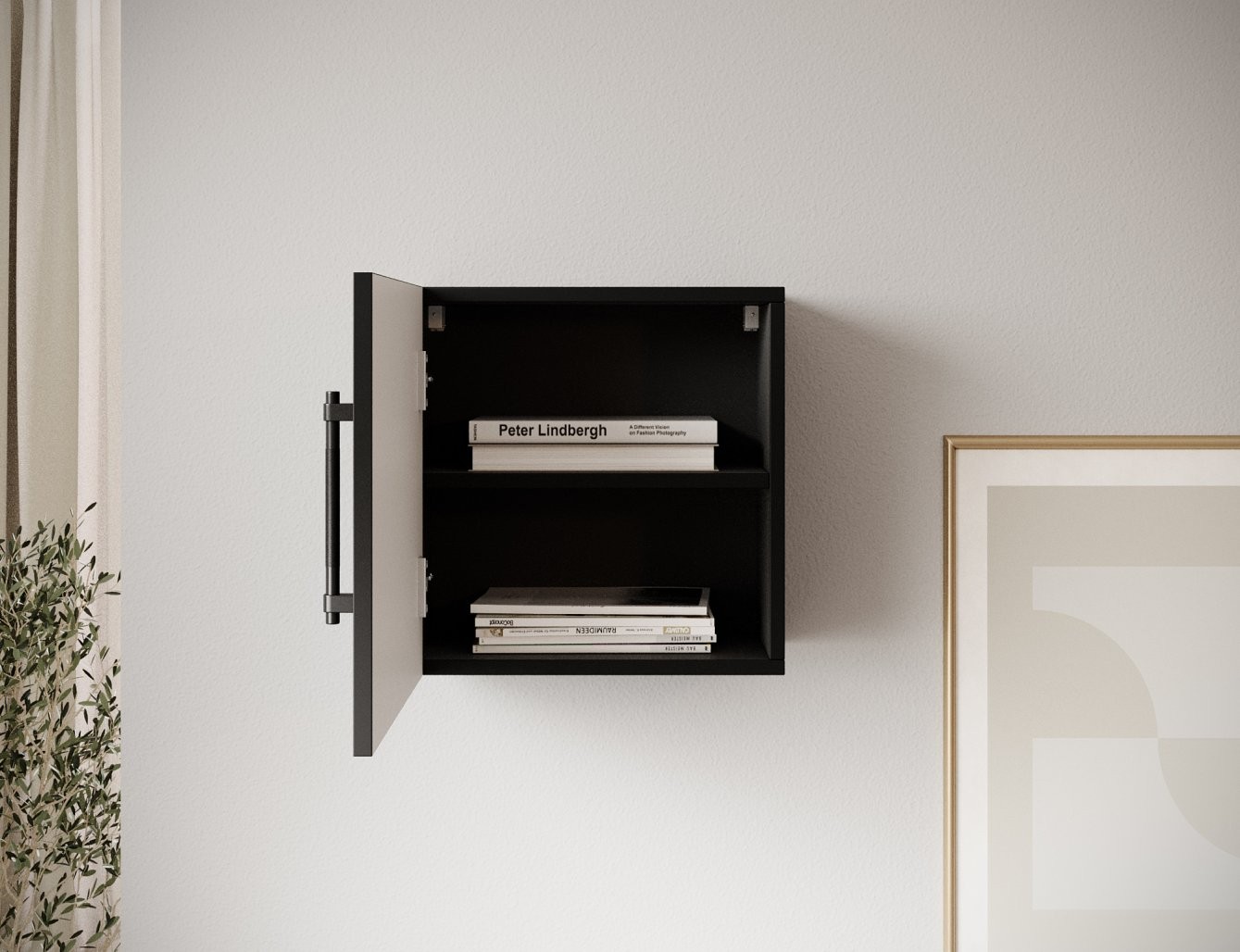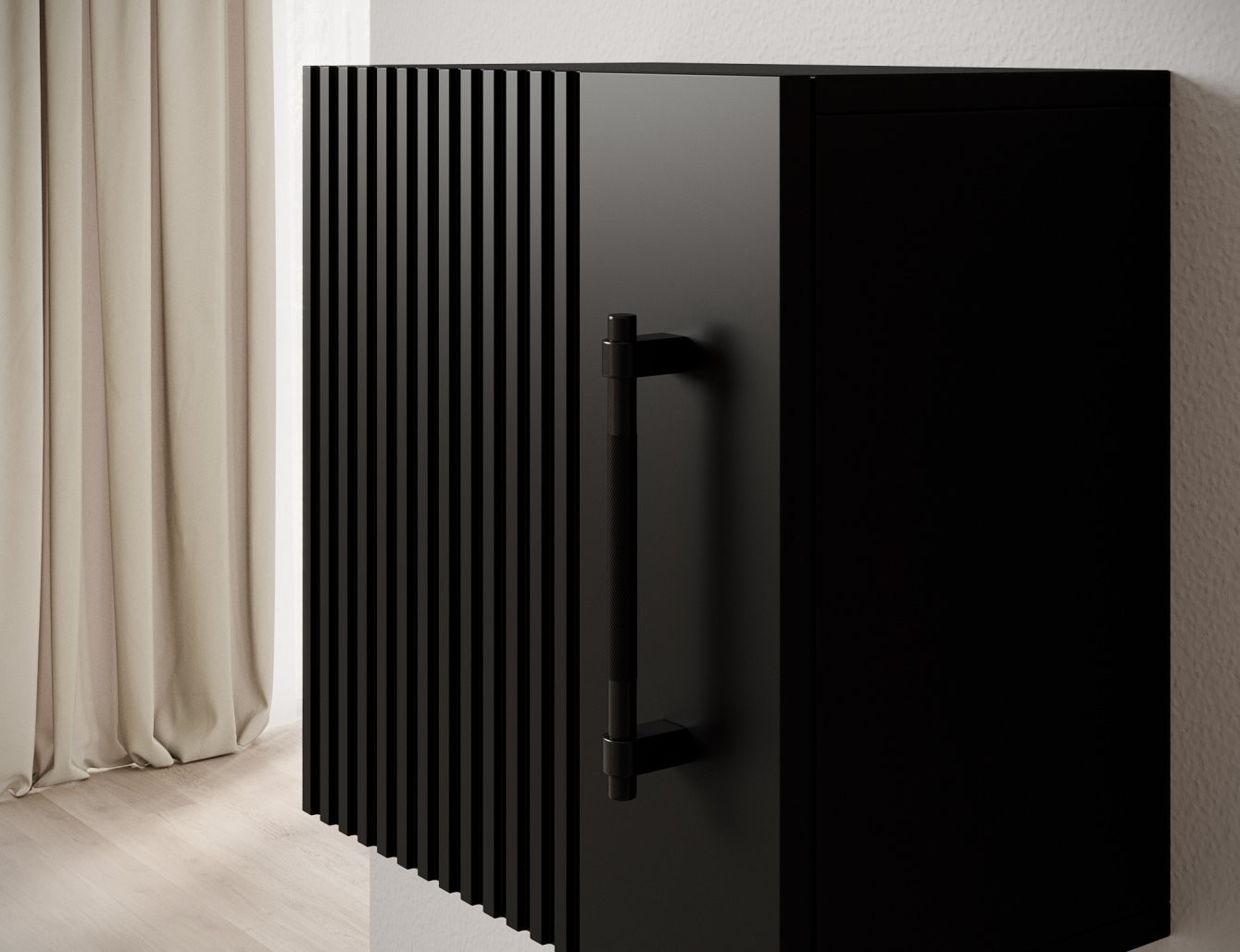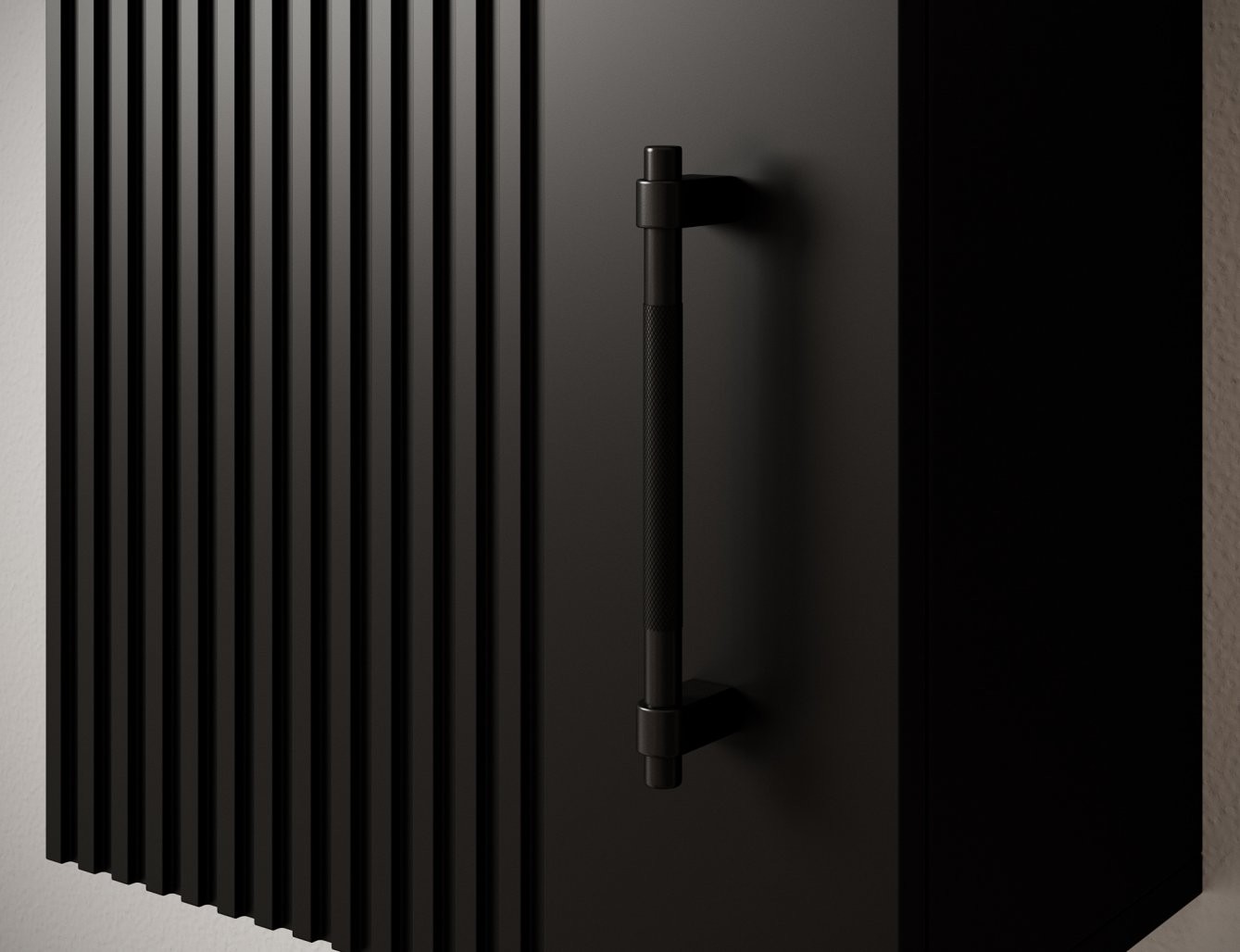 Opremljen je krilnim vratima postavljenim na šarkama s mekim zatvaranjem (soft-close), što osigurava tihu i udobnu upotrebu. Crne aluminijske ručke nadopunjuju cjelokupni dizajn i naglašavaju industrijski karakter ovog ormarića.