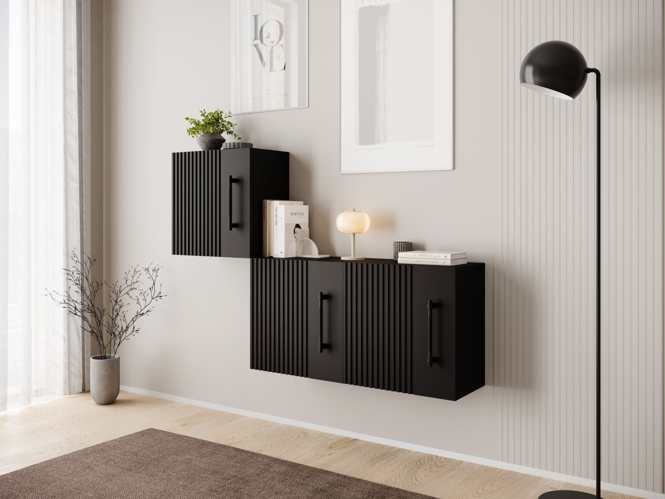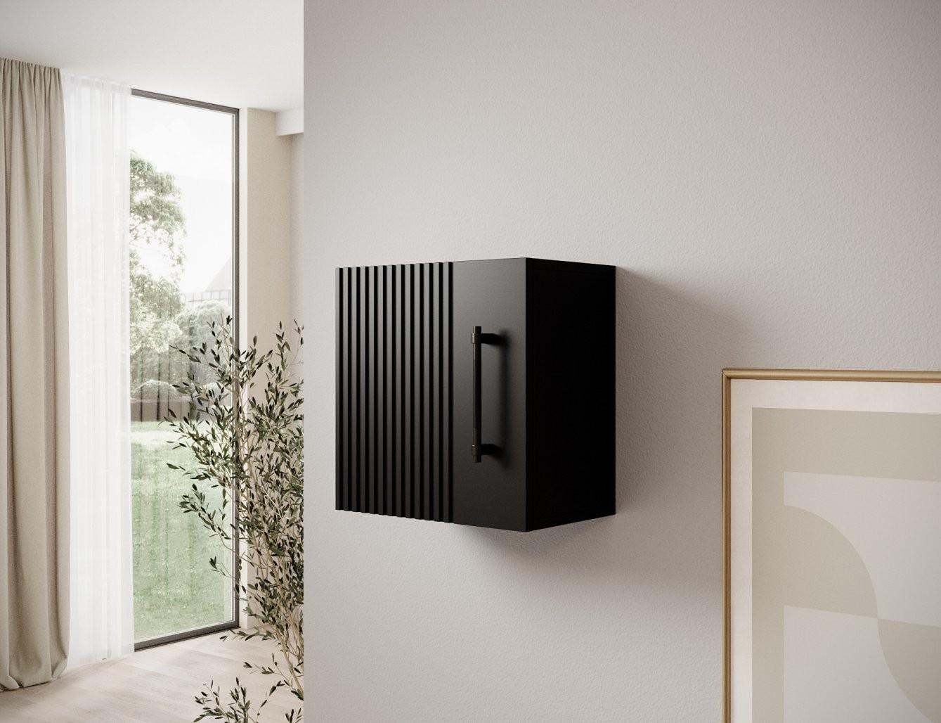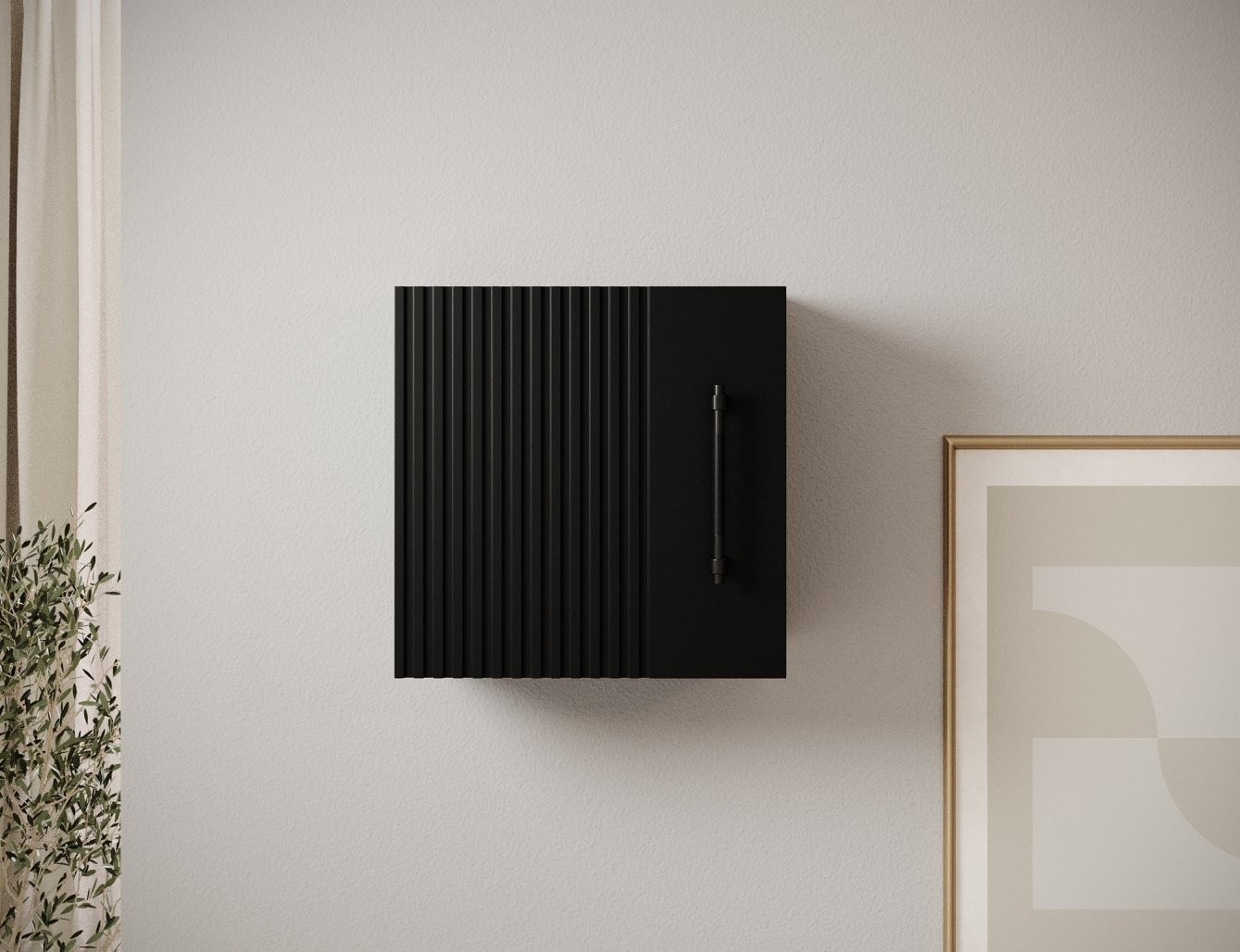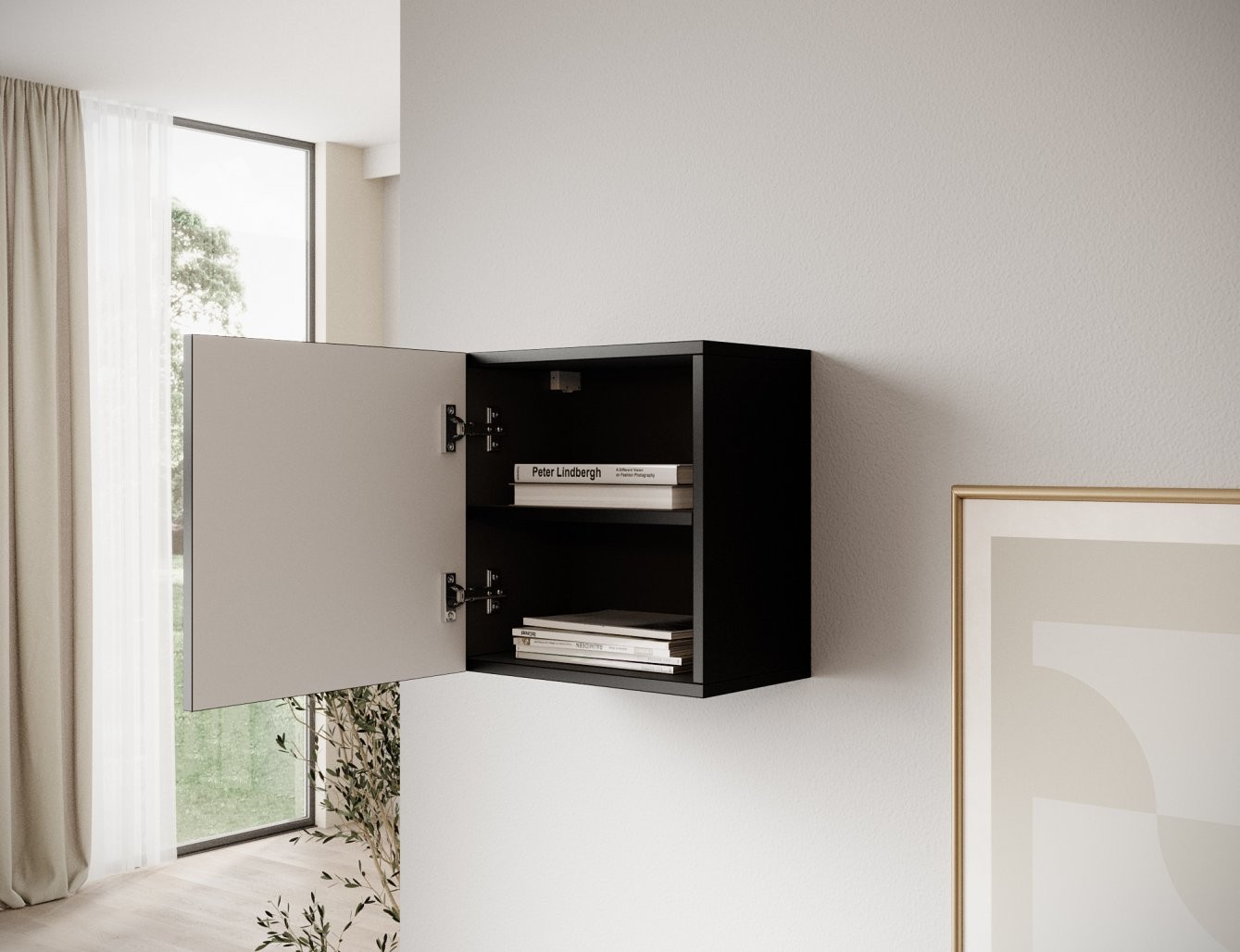 Opremljen je krilnim vratima postavljenim na šarkama s mekim zatvaranjem (soft-close), što osigurava tihu i udobnu upotrebu. Crne aluminijske ručke nadopunjuju cjelokupni dizajn i naglašavaju industrijski karakter ovog ormarića.