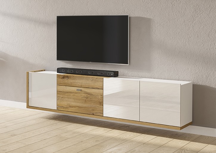 Zidni TV ormarić LARS sadrži čak četvero vrata i ladicu u koju možete pohraniti knjige, društvene igre i druge proizvode za koje nemate mjesta. TV komoda dostupna je u kombinaciji svijetlog hrasta i bijele boje visokog sjaja koja će uljepšati Vaš prostor.