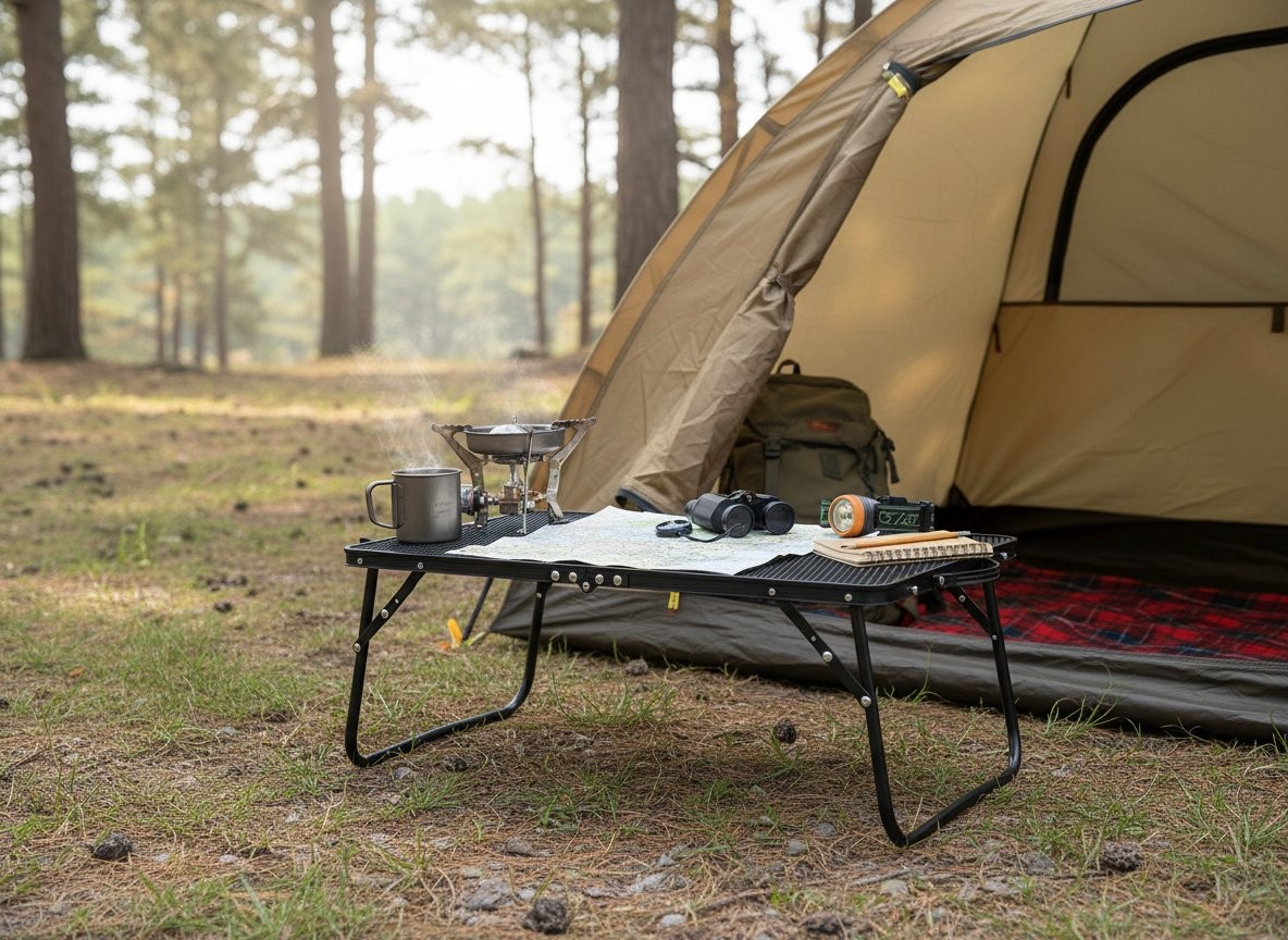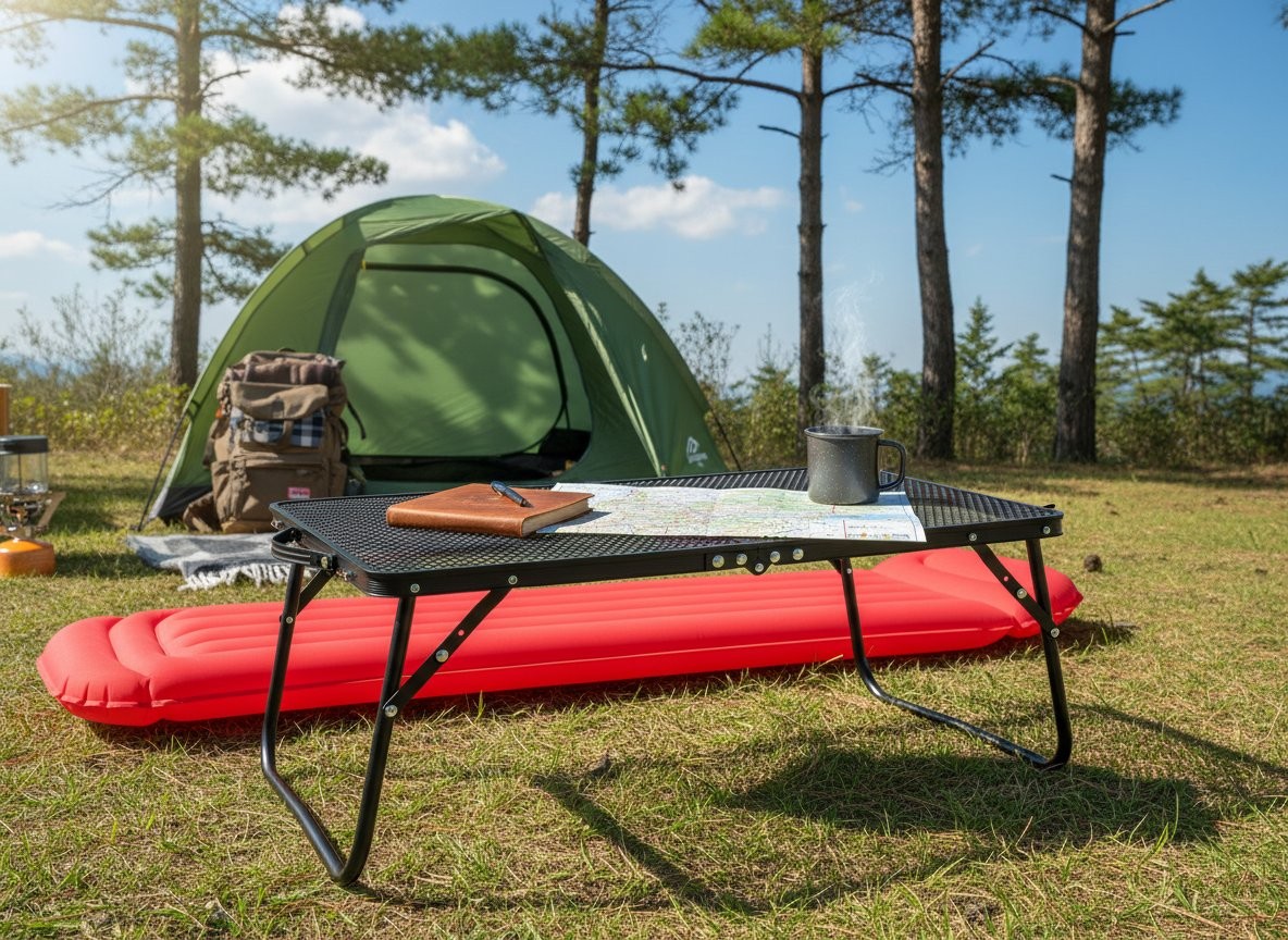 Plošča velikosti 60 × 40 cm nudi praktičen prostor za jedačo, pijačo ili manjše pripomočke. Zaradi kompaktne oblike je miza primerna za prevoz i shranjevanje. Črna izvedba deluje nevpadljivo i uporabno v različnih plenernih postavitvah.